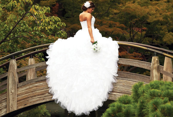 a dipped neckline and corset closure. The A-line skirt was decorated with Mikado